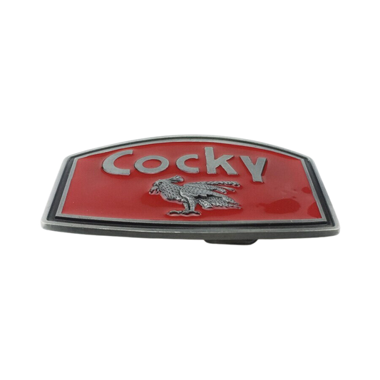 COCKY Belt Buckle with Red Enamel and Pewter Finish