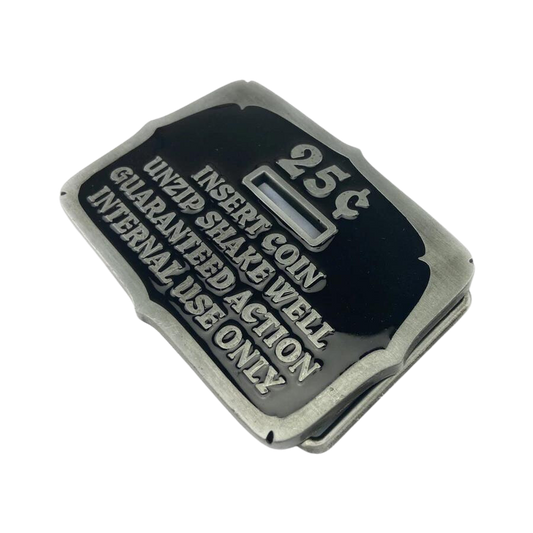 Insert Coins Belt Buckle with Pewter Finish and Black Background