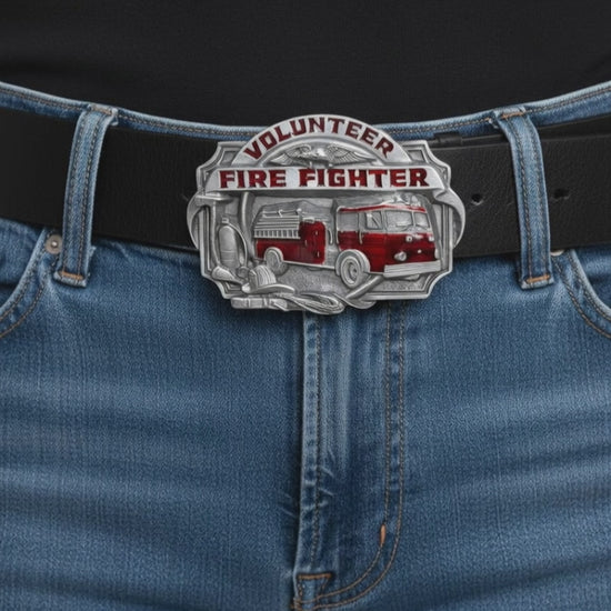 This Volunteer Fire Fighter Belt Buckle is a bold tribute to that service, featuring raised lettering, a detailed fire truck design, and deep red enamel accents set into an antique silver finish.