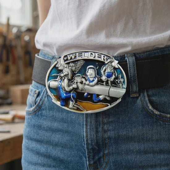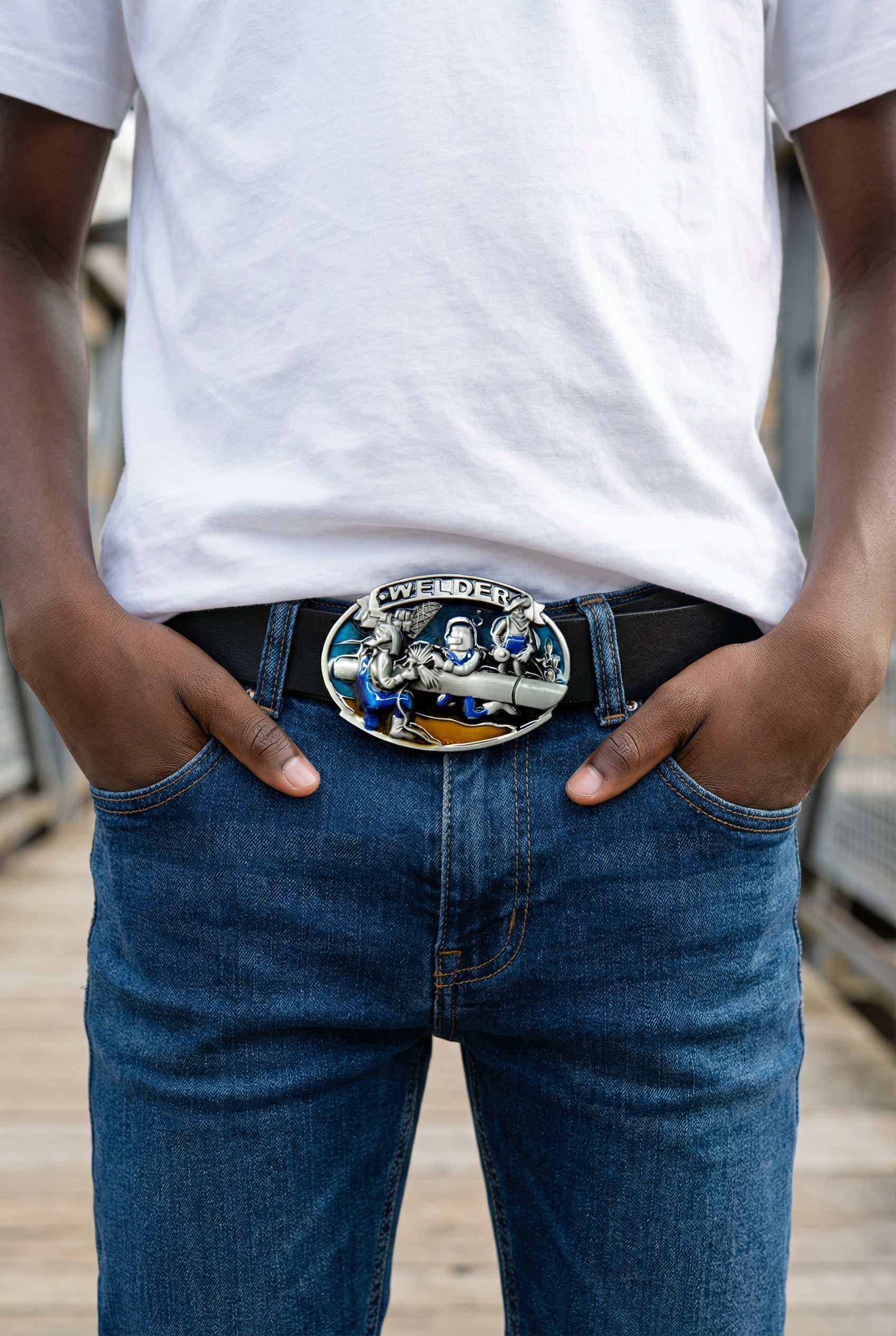 This Welder Belt Buckle features a bold trade-inspired design with welders at work, torch detail, and vivid enamel accents in deep blue and amber tones. It’s a powerful tribute to the craft — tough, skilled, and proudly earned.