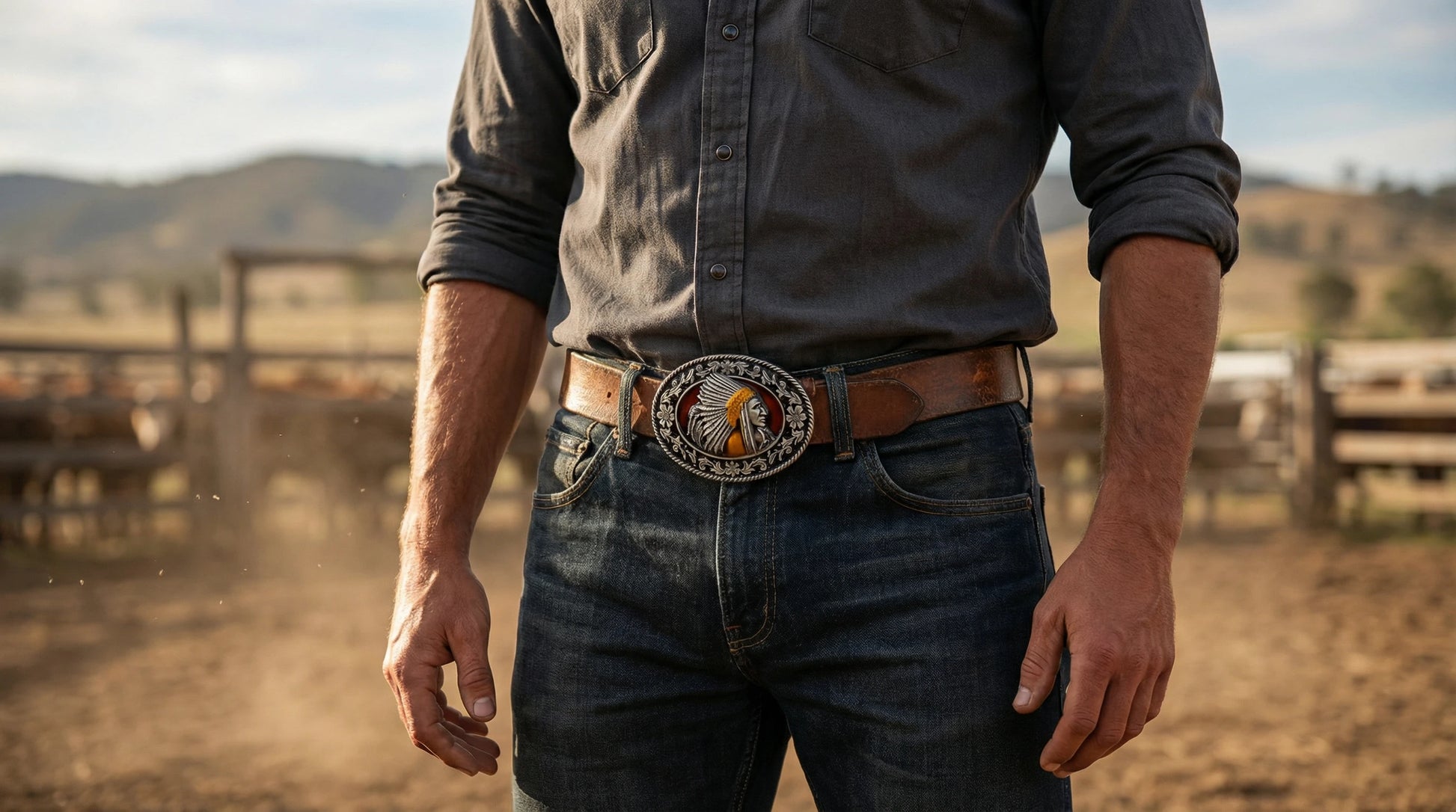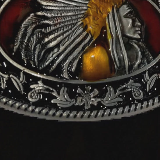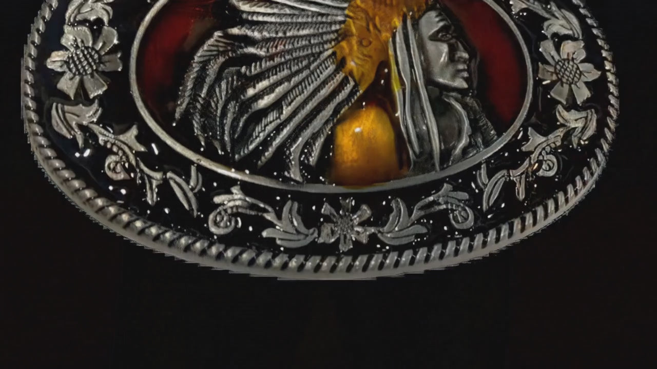The Western Chief Oval Belt Buckle is made to stand out at the arena, on the rail, or anywhere country style matters. Featuring a detailed silver chief profile set against a deep black enamel background with subtle red undertones and gold-tone accents, this buckle delivers strong contrast and sharp definition.